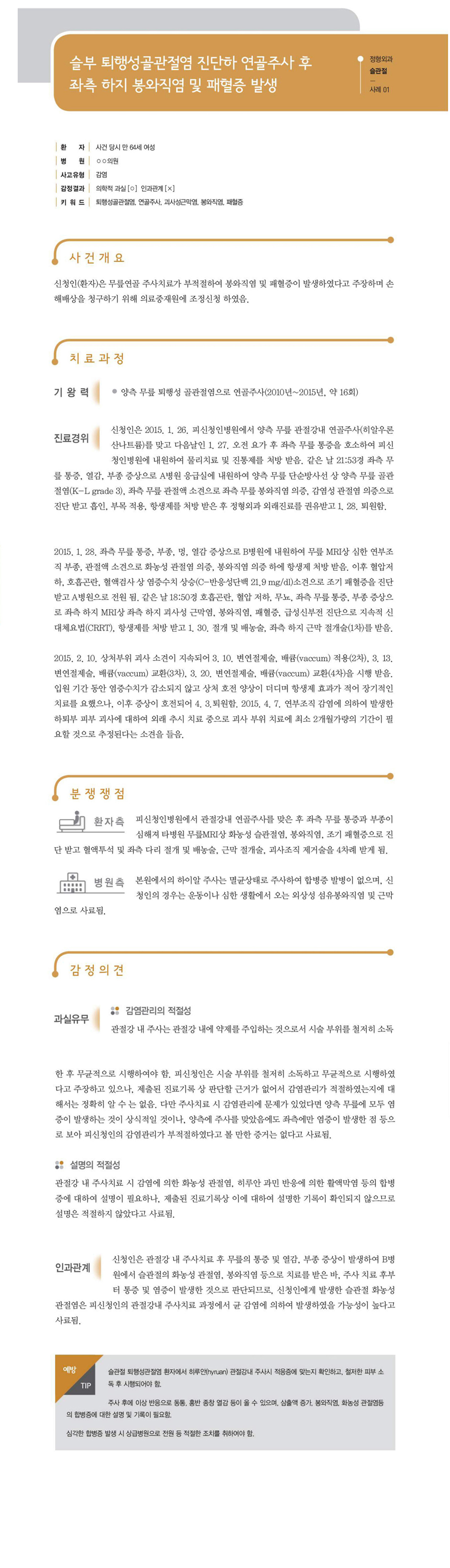"[ 정형외과 ] [정형외과-슬관절] 슬부 퇴행성골관절염 진단하 연골주사 후 좌측 하지 봉와직염 및 패혈증 발생" 상세페이지