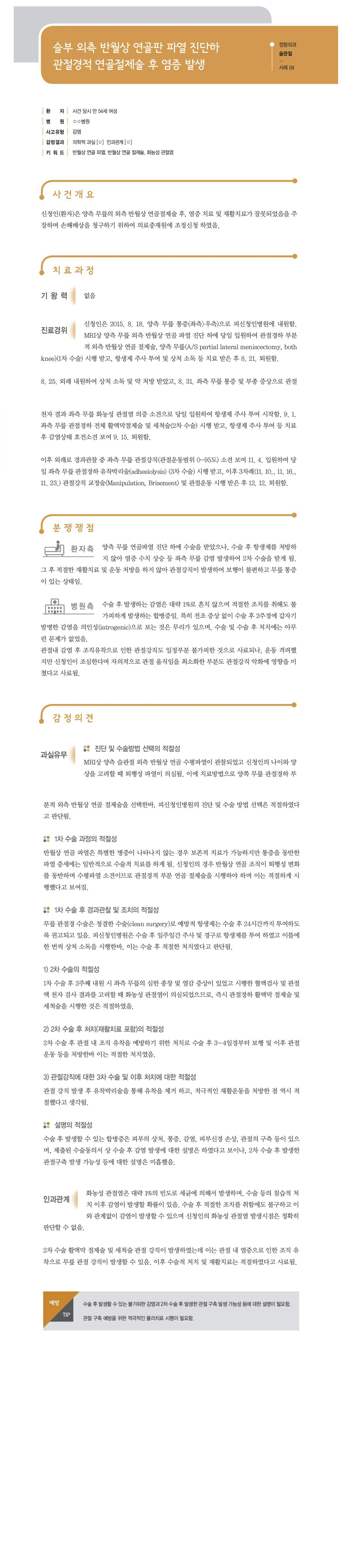 "[ 정형외과 ] [정형외과-슬관절] 슬부 외측 반월상 연골판 파열 진단하 관절경적 연골절제술 후 염증 발생" 상세페이지