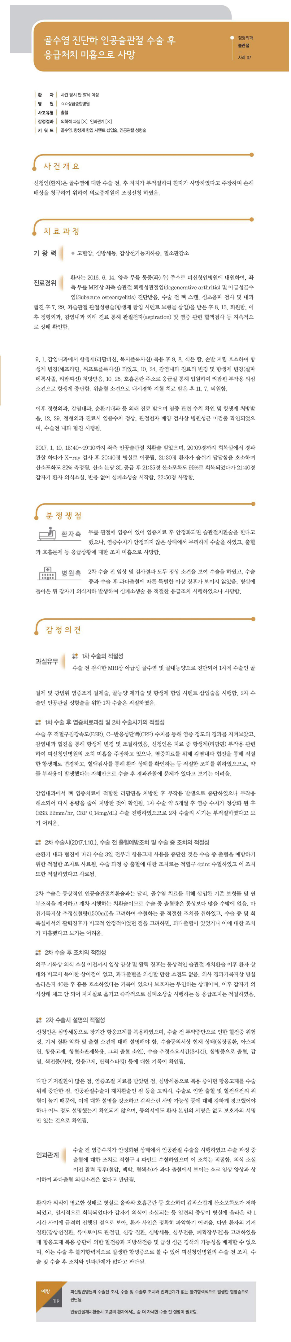 "[ 정형외과 ] [정형외과-슬관절] 골수염 진단하 인공슬관절 수술 후 응급처치 미흡으로 사망" 상세페이지