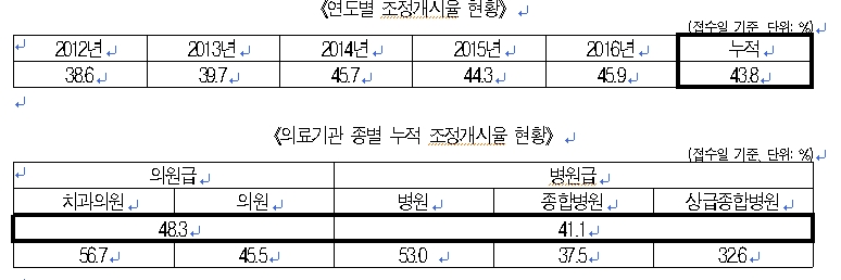 □ 최근 5년간 조정 신청된 사건의 43.8%가 피신청인의 동의를 얻어 조정 절차를 개시되었으며, ○ ’16년 조정개시율이 45.9%로 창립 이후 가장 높았고, 가장 낮았던 ’12년 38.6% 대비 7.3%p 올랐다. 조정신청 상위 5개 의료기관 종별*의 조정개시율 현황을 살펴보면 의원급의 개시율이 48.3%으로 병원급 41.1%보다 높았다. * 상위 5개 의료기관 종별 조정신청 현황: 종합병원(1,810건), 병원(1,581건), 의원(1,569건), 상급종합병원(1,455건), 치과의원(516건)