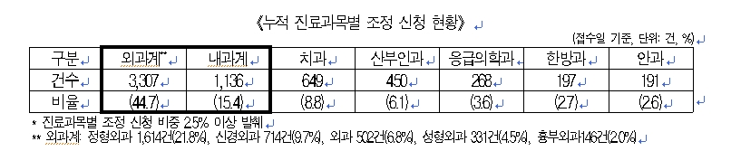 □ 의료분쟁 상담 및 조정신청 현황 추이를 분석한 결과, 상담건수는 연 평균 11.7%, 조정 신청건수는 연 평균 30.5% 증가세를 보이고 있다. ○ 의료분쟁 상담*은 5년 간 누적 19만 건을 실시하여 ’15년(39,793건) 일시적인 감소를 제외하고는 연 평균 11.7%로 증가한 것으로 나타났다. ○ 조정 신청도 ’15년(1,691건) 일시적인 감소를 제외하고 연 평균 30.5%(누적 7,394건)로 증가하였으며, 진료과목별 현황을 비교하면 외과계와 내과계가 전체 조정 신청 건수의 60.1%를 차지하는 것으로 나타났다.