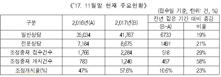 ○ ‘16년 같은 기간과 비교 시 조정개시율은 47% 대비 57.6%로 10.6%p 증가하였다.