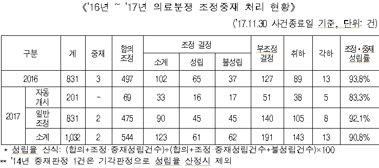 의료분쟁조정 자동개시 시행 1주년, 자동개시 사건 361건 접수 - ’16.11.30. 개정 의료분쟁조정법 시행 이후 조정개시율 57.6%(’17.11월)로 ’16년 대비 10.6%p 증가 - □ 한국의료분쟁조정중재원(원장 박국수, 이하 ‘의료중재원’)은 개정 의료분쟁조정법 시행 1주년(’16.12월~’17.11월)을 맞아 「자동개시* 관련 현황」을 발표하였다. □ 개정 의료분쟁조정법 시행 이후 ‘17년 1월*에서 11월 말 현재까지 조정 신청건수는 2,284건이고 이중 자동개시는 361건이며,