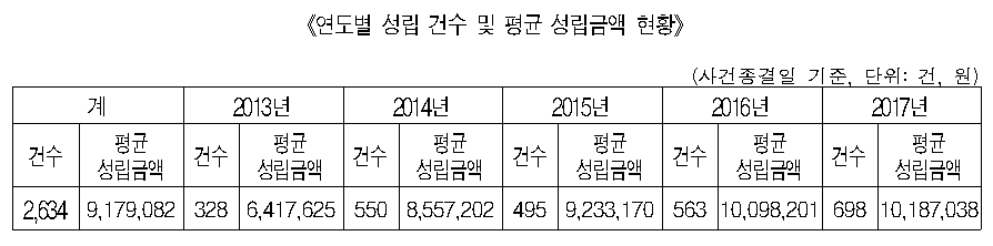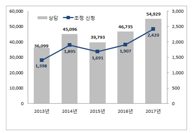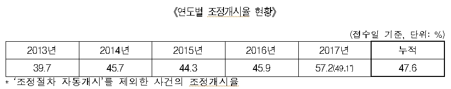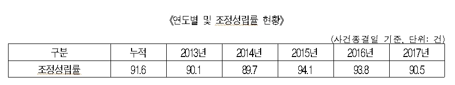 ○ 최근 5년간 누적 조정성립률은 91.6%로 나타났다. 2017년의 경우 90.5%로 전년(2016년)대비 3.3%p 하락한 것으로 나타났다.