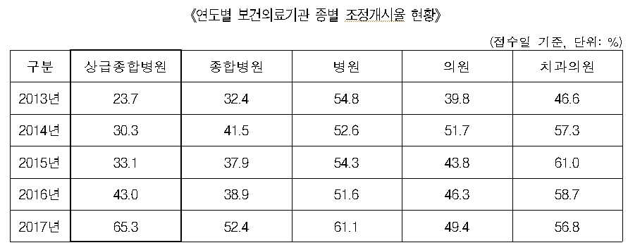 ○ 조정 신청이 많은 상위 5개 보건의료기관 종별* 조정개시율 추이를 살펴보면 상급종합병원이 가장 큰 증가세를 보여 2017년 65.3%의 조정개시율을 나타냈다.