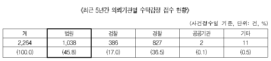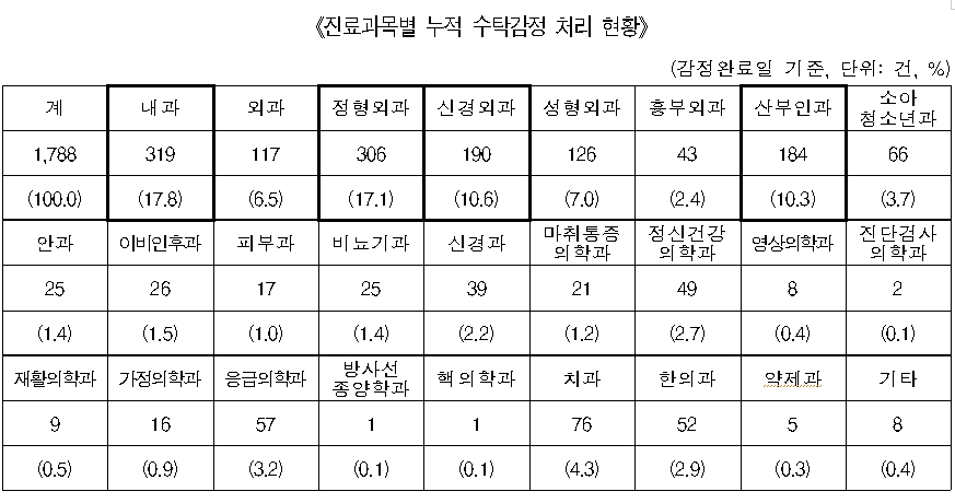 □ 다른 기관에서 의뢰한 수탁감정의 접수 건수는 최근 5년간 2,264건으로 법원(1,038건, 45.8%)의 의뢰가 가장 많았고, 이 중 감정 처리가 완료된 1,788건을 진료과목별로 살펴보면 내과 (318건, 17.8%), 정형외과(306건, 17.1%), 신경외과(10.6%), 산부인과(184건, 10.3%) 순으로 나타났다.