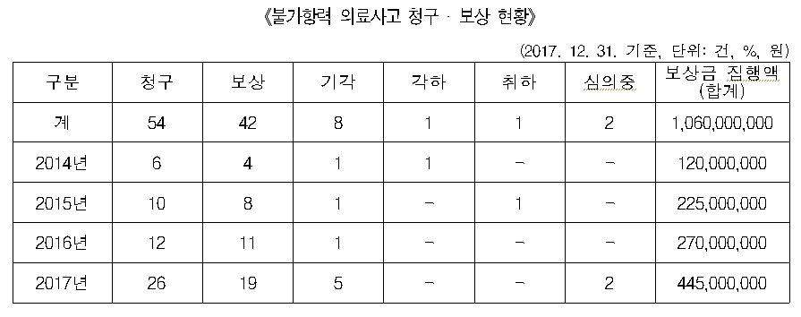 □ 불가항력 의료사고 보상제도 시행(2013. 4. 8.) 이후 보상 청구는 꾸준히 증가하여 2017년 26건이 청구되었고, 이 중 19건에 대해 보상금을 지급하였다.