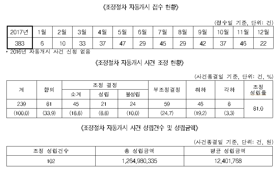 ○ 조정․중재가 성립된 2,634건의 평균 성립금액은 약 918만 원, 총 성립금액은 약 241억7,770만 원으로 나타났다. □ 조정절차 자동개시는 법 시행(2016. 11. 30.) 이후 약 한 달간 해당 사건의 신청이 없었으나, 2017년 1월 처음 접수 후 꾸준히 증가하여 총 383건이 접수되었다. 이 중 종결된 239건의 조정성립률은 81.0%, 총 성립금액은 12억6,498만 원으로 나타났다.
